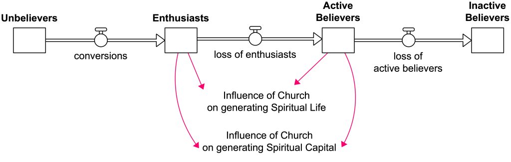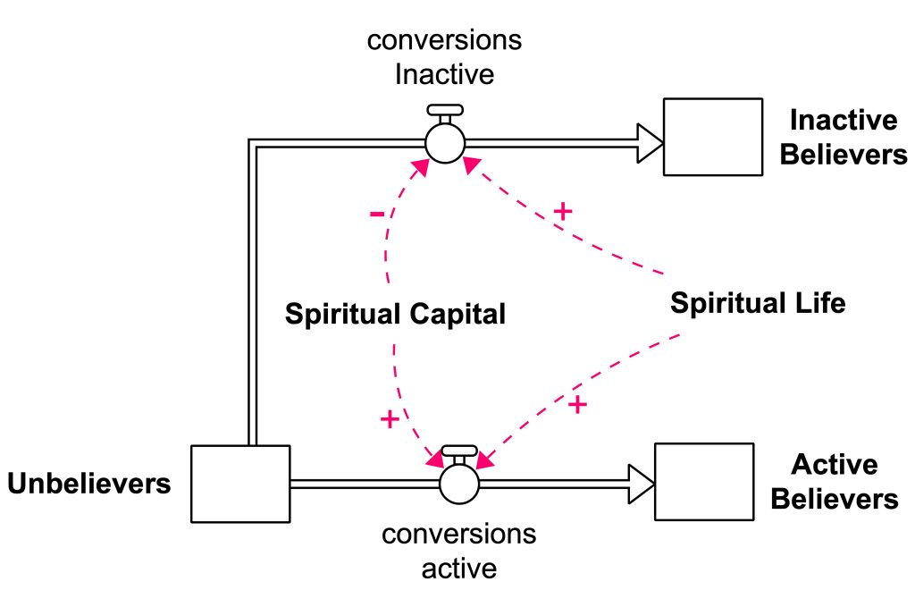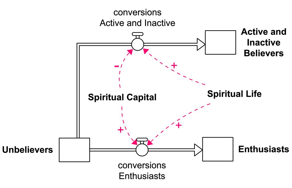 Spiritual life enhances conversions to enthusiasts, as well as active and inactive believers. However, spiritual capital only enhances enthusiasts at the expense of diminishing the other categories, Figure 5 (negative link from capital to active and inactive flow). This process represents discipleship aimed at enhancing enthusiasts.