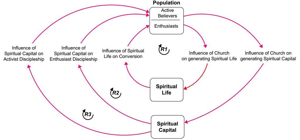 2. Spiritual Capital Hypothesis. The church generates spiritual capital, which in turn enhances the quality of the church’s conversions. Higher quality means a greater proportion of enthusiasts, loop R2, and activists, loop R3, Figure 1. These proportions models the discipleship of new believers.