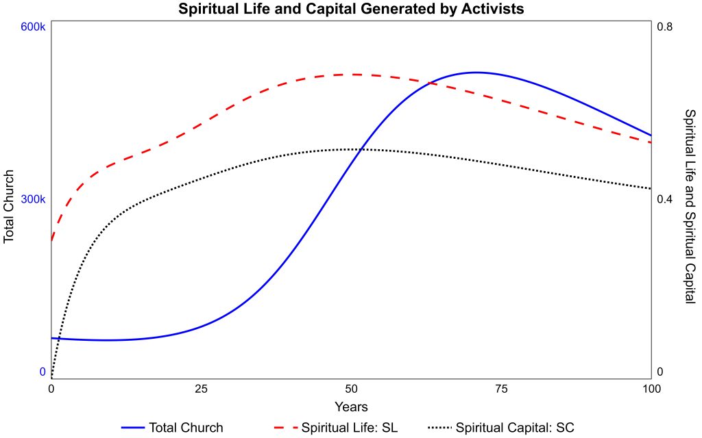 Spiritual capital is an accumulation that persists over time. For example, if activists begin discipleship training, it will continue as long as there are enough activists to support it. However, since spiritual capital naturally decays, maintaining activist numbers is essential to sustain its production. If the number of activists decreases, spiritual capital also declines.