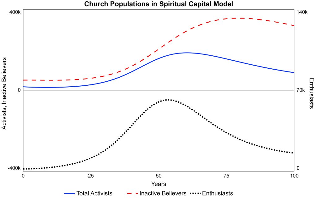 I assume that the primary role of spiritual capital is to produce a higher balance between active and inactive church members. In the context of the Limited Enthusiasm Model with Activists, this effect is achieved by linking spiritual capital to the fractions of converts who become active and enthusiasts. I will include further effects as the model develops.