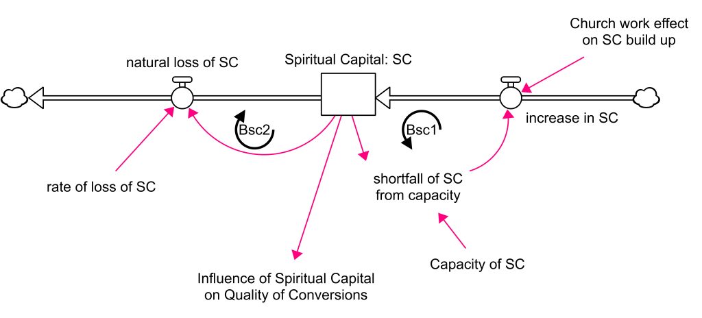 Both spiritual capital and life are modelled on a scale of zero to one using a single soft variable. Figure 3 shows the model of spiritual capital.. Balancing loop Bsc1 prevents the variable from exceeding its capacity of unity by making spiritual capital harder to produce as it approaches capacity. If the church fails to produce spiritual capital, perhaps due to insufficient activists, then the capital naturally decays, loop Bsl2. A church needs to actively maintain its spiritual capital; otherwise, it will fall away. The stock flow model has the same structure as that of spiritual life, but its parameter values and their meanings differ.