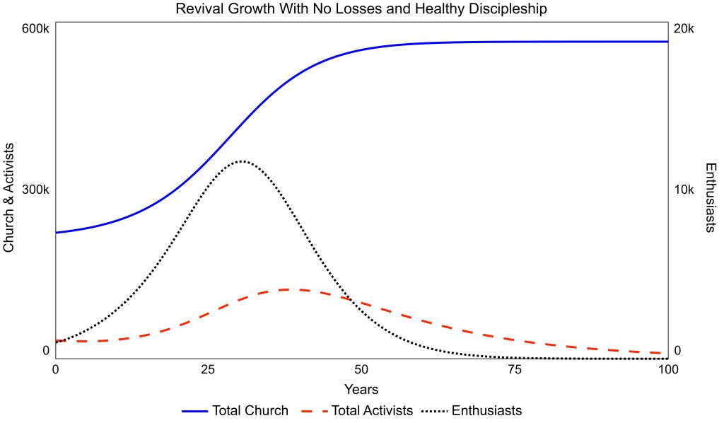 Figure 1: Revival Growth in the Spiritual Life Model with no Losses. Church, Activists and Enthusiasts