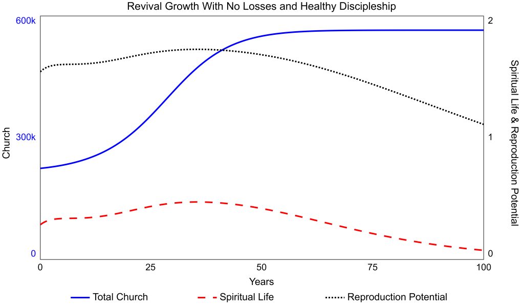 Figure 2: Revival Growth in the Spiritual Life Model with no Losses. Church, Spiritual Life and Reproduction Potential